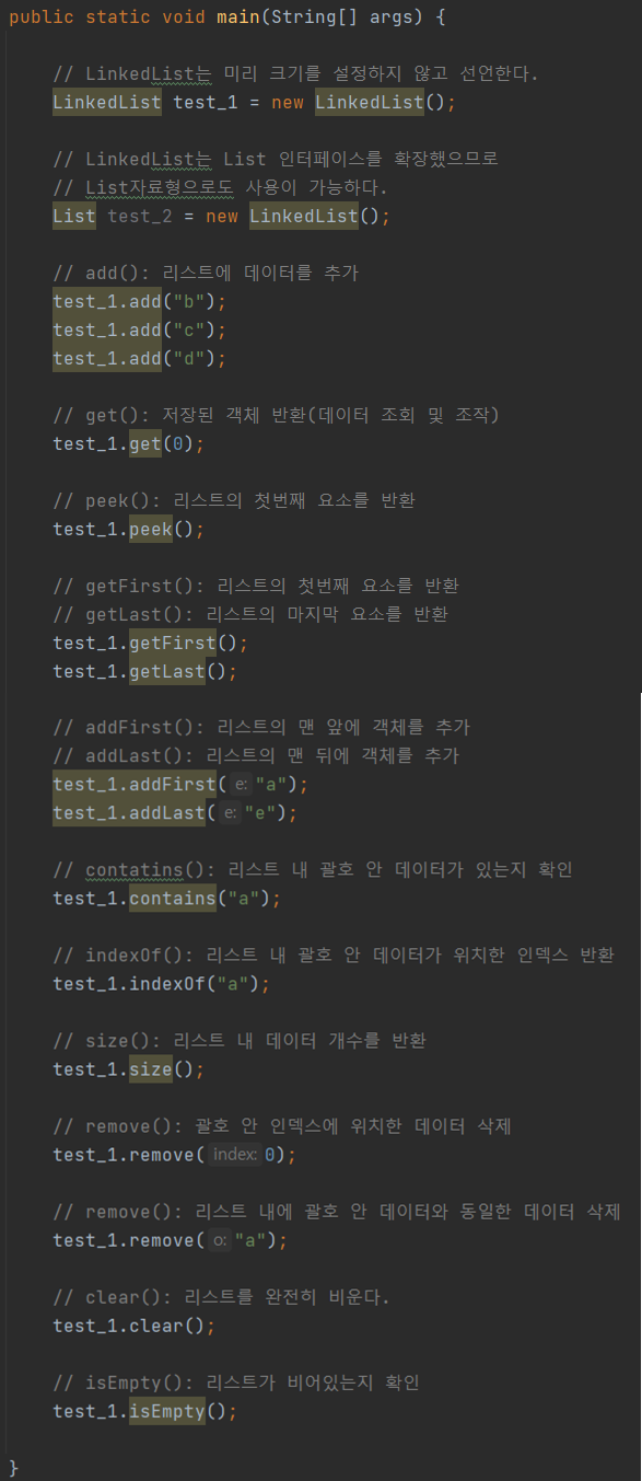 public static void main(String[] args) { // LinkedList는 미리 크기를 설정하지 않고 선언한다. LinkedList test_1 = new LinkedList(); // LinkedList는 List 인터페이스를 확장했으므로 // List자료형으로도 사용이 가능하다. List test_2 = new LinkedList(); // add(): 리스트에 데이터를 추가 test_1.add("b"); test_1.add("c"); test_1.add("d"); // get(): 저장된 객체 반환(데이터 조회 및 조작) test_1.get(0); // peek(): 리스트의 첫번째 요소를 반환 test_1.peek(); // getFirst(): 리스트의 첫번째 요소를 반환 // getLast(): 리스트의 마지막 요소를 반환 test_1.getFirst(); test_1.getLast(); // addFirst(): 리스트의 맨 앞에 객체를 추가 // addLast(): 리스트의 맨 뒤에 객체를 추가 test_1.addFirst("a"); test_1.addLast("e"); // contatins(): 리스트 내 괄호 안 데이터가 있는지 확인 test_1.contains("a"); // indexOf(): 리스트 내 괄호 안 데이터가 위치한 인덱스 반환 test_1.indexOf("a"); // size(): 리스트 내 데이터 개수를 반환 test_1.size(); // remove(): 괄호 안 인덱스에 위치한 데이터 삭제 test_1.remove(0); // remove(): 리스트 내에 괄호 안 데이터와 동일한 데이터 삭제 test_1.remove("a"); // clear(): 리스트를 완전히 비운다. test_1.clear(); // isEmpty(): 리스트가 비어있는지 확인 test_1.isEmpty(); }LinkedList와 ArrayList