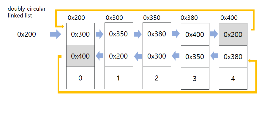 다음 요소의 주소값을 갖고 맨 뒤 요소는 맨 앞 요소의 주소, 이전 요소의 주소값을 갖는다.