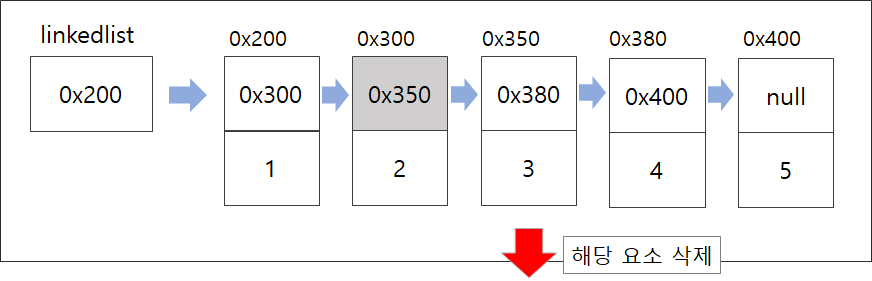 중간 요소가 삭제될 경우 요소를 삭제하면서 삭제되는 요소 이전에 위치한 요소가 가진 참조만 변경해준다.