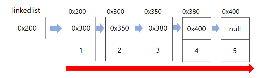 위 그림을 보면 알겠지만 연결리스트는 빨간 화살표 방향으로 단방향 이동을 한다.