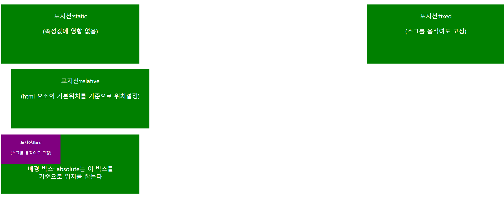 <body> <p style="position: static;"> <br>포지션:static<br><br>(속성값에 영향 없음) </p> <p style="position: relative; left: 50px;"> <br>포지션:relative<br><br>(html 요소의 기본위치를 기준으로 위치설정) </p> <p style="position: fixed; top: 0px; right: 0px;"> <br>포지션:fixed<br><br>(스크롤 움직여도 고정) </p> <div style="position: relative;"> <div id = "div2" style="position: absolute;"> <br>포지션:fixed<br><br>(스크롤 움직여도 고정) </div> <br><br><br><br>배경 박스: absolute는 이 박스를<br>기준으로 위치를 잡는다 </div> </body>'프론트엔드 > CSS' 카테고리의 다른 글