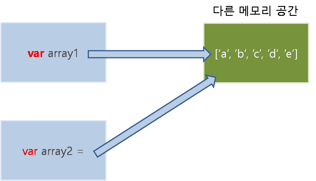<body> <script> var array1 = ["사자","호랑이","너구리"]; var array2; array2 = array1; console.log(array1); // ["사자","호랑이","너구리"] 출력 console.log(array2); // ["사자","호랑이","너구리"] 출력 array1[0] = "반달곰"; console.log(array1); // ["반달곰","호랑이","너구리"] console.log(array2); // ["반달곰","호랑이","너구리"] </script> </body>배열 객체의 경우 복사를 시행하고 복사된 배열 객체를 수정했더니 원본이 변했다.