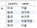 select distinct country, name from web;위와 같이 코드를 입력하면 아래 사진과 같이 원하는 필드값만 중복없이 추려서 볼 수 있다.