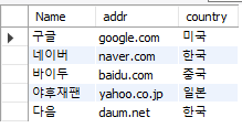 use testdb; -- 데이터 베이스 사용 create table Web( -- 테이블 생성 Name varchar(20) not null, addr varchar(20) not null, country varchar(20) not null ); INSERT INTO Web(Name, addr, country) values -- 테이블에 value 입력 ('구글', 'google.com', '미국'), ('네이버', 'naver.com', '한국'), ('바이두', 'baidu.com', '중국'), ('야후재팬', 'yahoo.co.jp', '일본'), ('다음', 'daum.net', '한국'); select * from web; -- web 테이블의 모든 데이터 선택