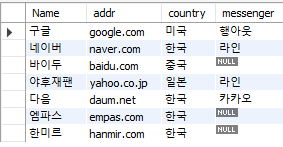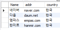 use testdb; -- 데이터 베이스 사용 create table Web( -- 테이블 생성 Name varchar(20) not null, addr varchar(20) not null, country varchar(20) not null ); INSERT INTO Web(Name, addr, country) values -- 테이블에 value 입력 ('구글', 'google.com', '미국'), ('네이버', 'naver.com', '한국'), ('바이두', 'baidu.com', '중국'), ('야후재팬', 'yahoo.co.jp', '일본'), ('다음', 'daum.net', '한국'), ('엠파스', 'empas.com', '한국'), ('한미르', 'hanmir.com', '한국'); select * from web; -- web 테이블의 모든 데이터 선택위 코드를 그대로 만들면 아래와 같은 결과가 나온다.