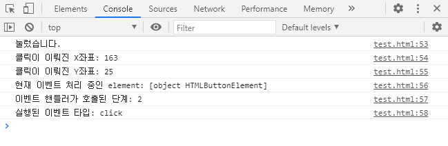 위 코드를 실행하고 화면 상의 버튼을 클릭하면 콘솔창에 다음과 같이 뜬다.