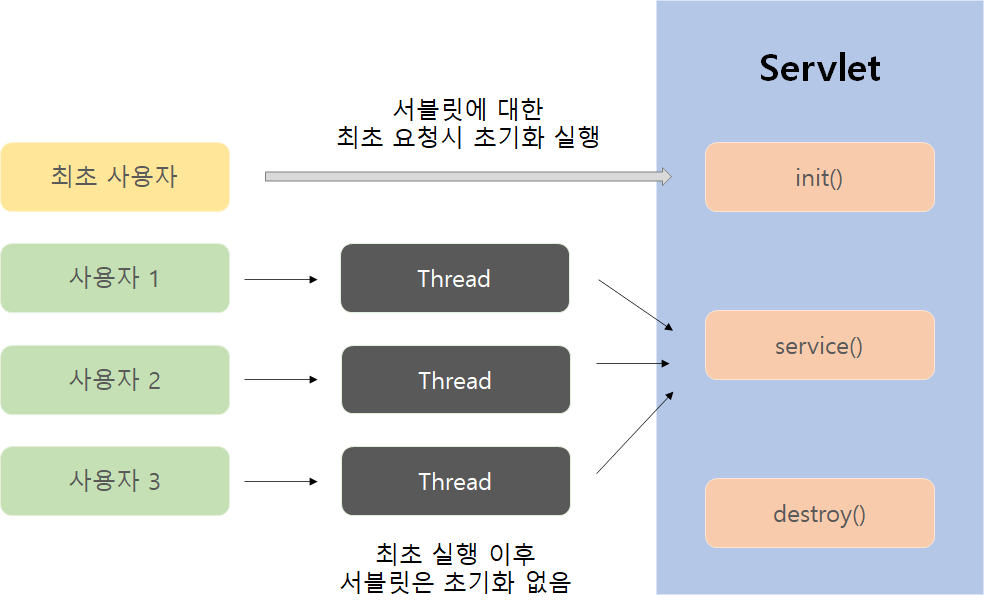 이렇게 스레드를 이용해 최초에 만든 인스턴스 하나로 서블릿의 service()메서드를 실행하여 처리한다.