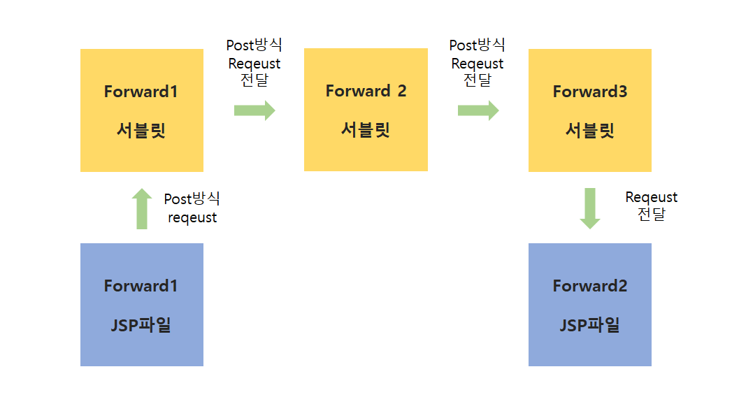 @WebServlet("/forward1") public class forward1 extends HttpServlet{ @Override protected void doPost(HttpServletRequest request, HttpServletResponse response) throws ServletException, IOException { // response할 때 인코딩해줄 문자 코드 설정 response.setCharacterEncoding("UTF-8"); response.setContentType("text/html; charset=UTF-8"); // jsp를 통해 전달된 문자열을 저장 String test_word = request.getParameter("f_test"); // request 객체에 jsp를 통해 전달된 문자열을 저장 request.setAttribute("f1", test_word); //RequestDispatcher 객체가 전달될 경로 지정 RequestDispatcher rd = request.getRequestDispatcher("forward2"); //forward를 통해 지정된 경로로 request, reponse 객체 전달 rd.forward(request, response); } }forward2 서블릿