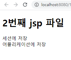 <%@ taglib prefix="c" uri="http://java.sun.com/jsp/jstl/core" %> <%@ page language="java" contentType="text/html; charset=UTF-8" pageEncoding="UTF-8"%> <!DOCTYPE html> <html> <head> <meta charset="UTF-8"> <title>Insert title here</title> </head> <body> <h1> 2번째 jsp 파일 </h1> <%= session.getAttribute("se") %> <br> <%= application.getAttribute("ap") %> </body> </html>결과물은 아래와 같다. 별다른 처리 없이 저장만 하면 어느 jsp파일에서든 로드가 가능하다.