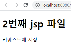 <%@ taglib prefix="c" uri="http://java.sun.com/jsp/jstl/core" %> <%@ page language="java" contentType="text/html; charset=UTF-8" pageEncoding="UTF-8"%> <!DOCTYPE html> <html> <head> <meta charset="UTF-8"> <title>Insert title here</title> </head> <body> <h1> 2번째 jsp 파일 </h1> <%= request.getAttribute("rq") %> </body> </html>결과는 아래와 같이 2번째 페이지로 request가 넘어갔고 거기서 데이터를 꺼내서 인쇄를 한 모습이다.