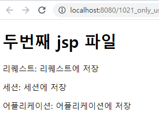 <%@ page language="java" contentType="text/html; charset=UTF-8" pageEncoding="UTF-8"%> <!DOCTYPE html> <html> <head> <meta charset="UTF-8"> <title>Insert title here</title> </head> <body> <h1> 두번째 jsp 파일 </h1> <p>리퀘스트: ${requestScope.test}</p> <p>세션: ${sessionScope.test} </p> <p>어플리케이션: ${applicationScope.test}</p> </body> </html>그리고 결과물은 아래와 같이 원하는 대로 출력된다.