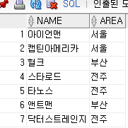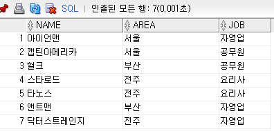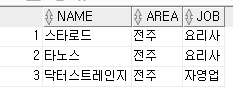 서브쿼리에서 데이터를 조회시 JOB을 제외하고 NAME, AREA만 조회했기 때문에