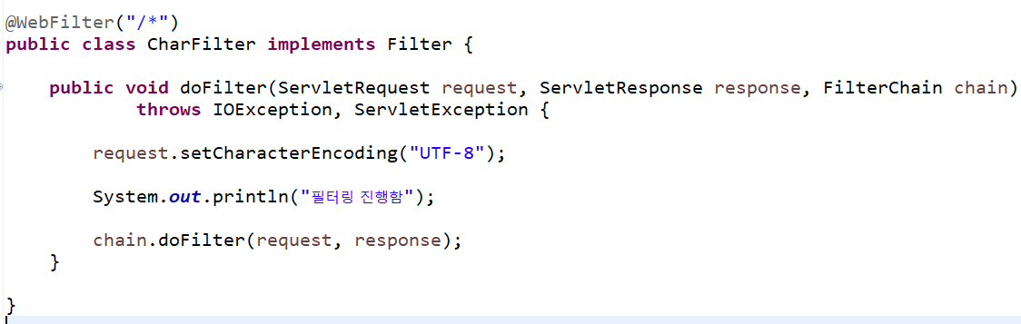 참고로 WebFilter는 해당 url로 들어오는 모든 요청은 doFilter를 통해 필터링 한다는 뜻이다.