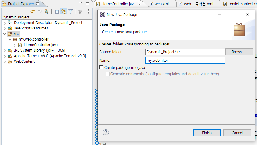 우선 지난 번에 컨트롤러 패키지를 만들어준 것처럼 src 폴더 안에 필터 서블릿을 작성할 패키지를 만든다.