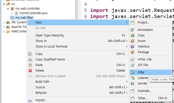 지난 번 서블릿과는 다르게 패키지 안에 필터를 만들어준다.