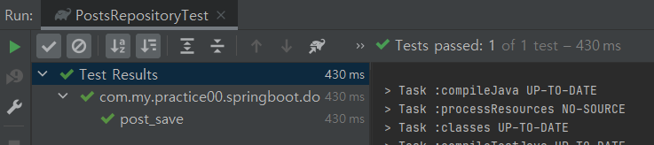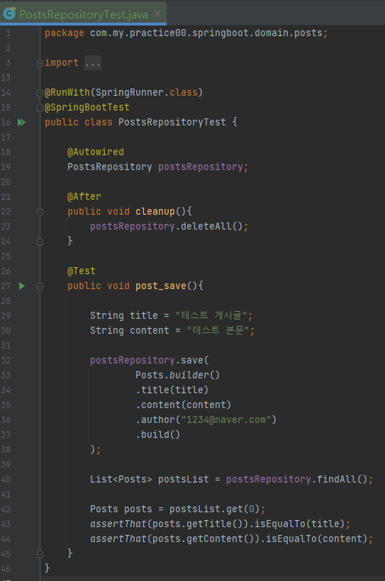 import org.junit.After; import org.junit.Test; import org.junit.runner.RunWith; import org.springframework.beans.factory.annotation.Autowired; import org.springframework.boot.test.context.SpringBootTest; import org.springframework.test.context.junit4.SpringRunner; import java.util.List; import static org.assertj.core.api.Assertions.assertThat; @RunWith(SpringRunner.class) @SpringBootTest public class PostsRepositoryTest { @Autowired PostsRepository postsRepository; @After public void cleanup(){ postsRepository.deleteAll(); } @Test public void post_save(){ String title = "테스트 게시글"; String content = "테스트 본문"; postsRepository.save( Posts.builder() .title(title) .content(content) .author("1234@naver.com") .build() ); List<Posts> postsList = postsRepository.findAll(); Posts posts = postsList.get(0); assertThat(posts.getTitle()).isEqualTo(title); assertThat(posts.getContent()).isEqualTo(content); } }해당 테스트는 save, findAll 기능을 테스트하는 것으로 해당 메서드는 jpa에서 자동으로 제공하는 것이다.