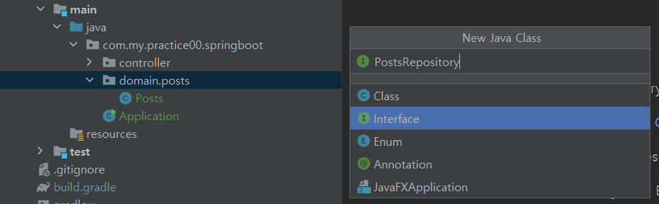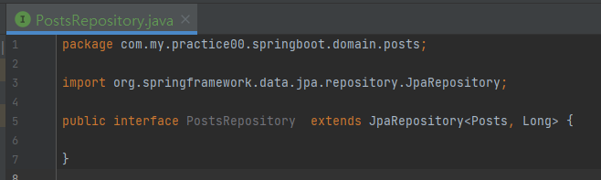 Posts 클래스를 완성했으면 다음은 PostsRepository 인터페이스를 생성한다.