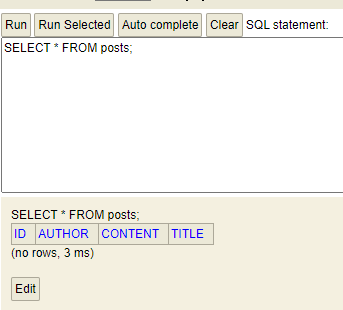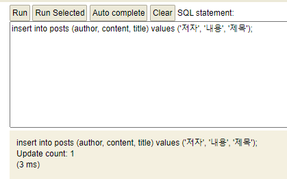 우선 위와 같이 insert into를 이용해서 posts 테이블에 자료를 입력하고 Run을 누른다.