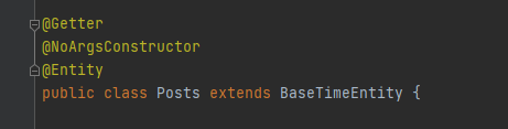 Posts 클래스로 이동한다음 BaseTimeEntity를 상속받도록 코드를 추가해준다.