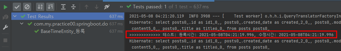 @Test public void BaseTimeEntity_등록(){ LocalDateTime now = LocalDateTime.of(2021,05,8,0,0,0); postsRepository.save( Posts.builder() .title("제목") .content("내용") .author("글쓴이") .build() ); List<Posts> postsList = postsRepository.findAll(); Posts posts = postsList.get(0); System.out.println(">>>>>>>>>>>>> 테스트: 등록시간: "+posts.getCreatedDate()+", 수정시간: "+posts.getModifiedDate()); assertThat(posts.getCreatedDate()).isAfter(now); assertThat(posts.getModifiedDate()).isAfter(now); }PostsRepositoryTest 클래스로 이동한 다음 위와 같이 메서드를 추가해준다.