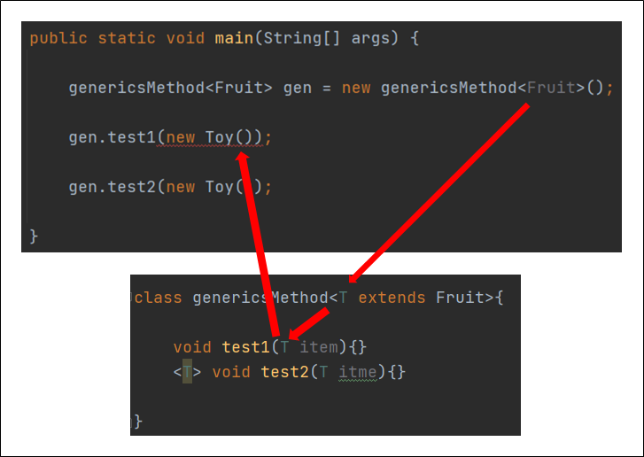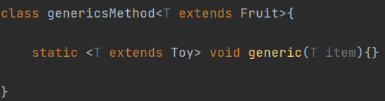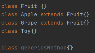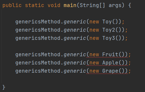 하지만 예상과 달리 genericsMethod의 객체는 Fruit의 자손이 아닌 Toy클래스의 객체도 T로 전달받았다.