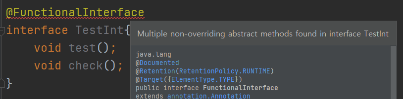 이때 @FuntionlInterface를 붙여주면 해당 인터페이스가 함수형 인터페이스에 적절한지 체크해준다.
