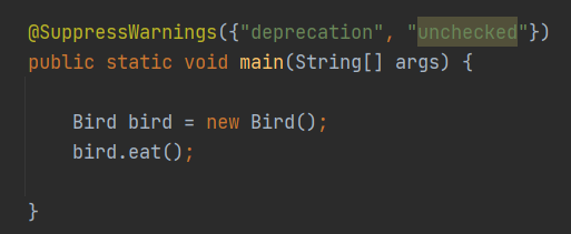 우선 위와 같이 @SuppressWarnings를 써주니 eat() 메서드에 쳐져있던 줄이 사라진 것을 볼 수 있다.