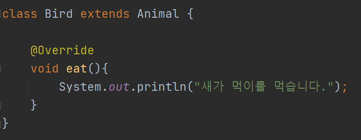 Bird는 Animal을 상속받았는데, eat() 메서드를 오버라이딩해서 내용을 바꾸고 싶다.