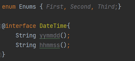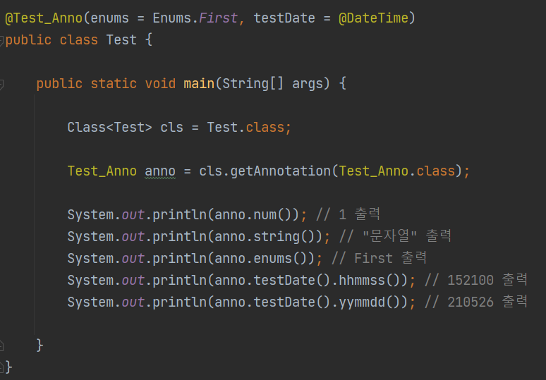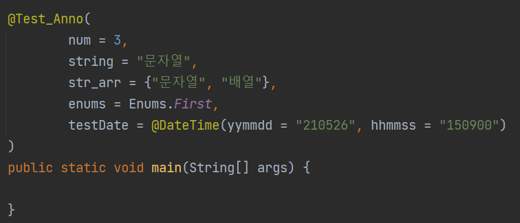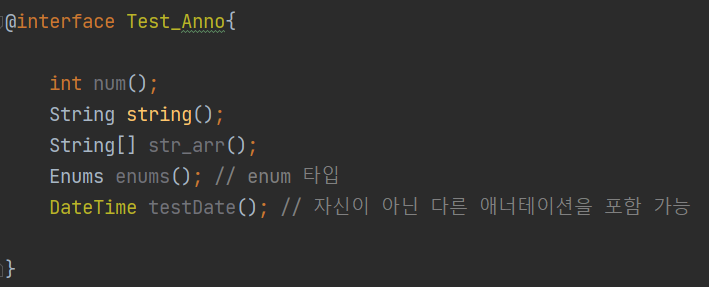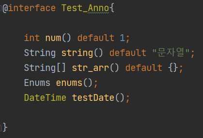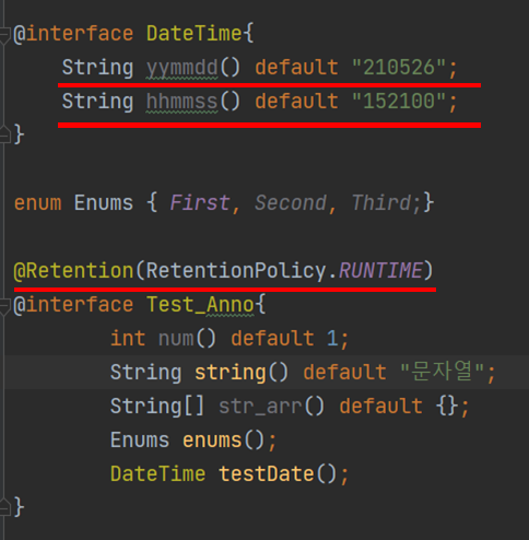 enums()는 열거형 데이터를 타입으로 가지는 요소이며, testDate()는 다른 애너테이션을 타입으로 가진다.