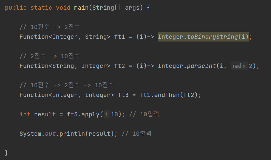 반면 참조변수 ft2는 2진수를 넣으면 10진수로 반환하는 람다식을 저장하고 있다.