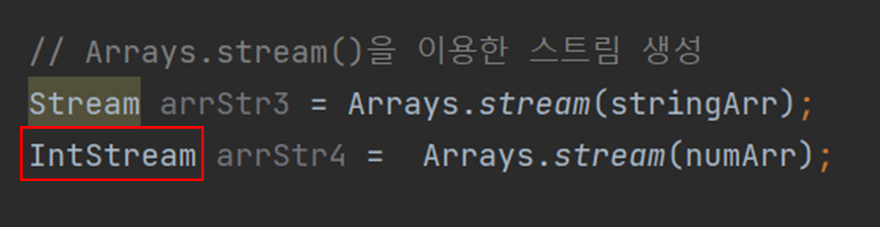 이러한 사실로 미뤄보아 Arrays.stream()의 경우 주어지는 인수의 타입에 따라 반환 타입도 달라짐을 알 수 있다.