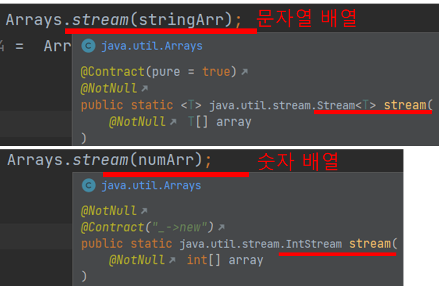 stream()를 사용할 때 문자열 배열과 숫자 배열을 매개변수로 제공할 때 참조변수 타입이 달라지는 것이다.