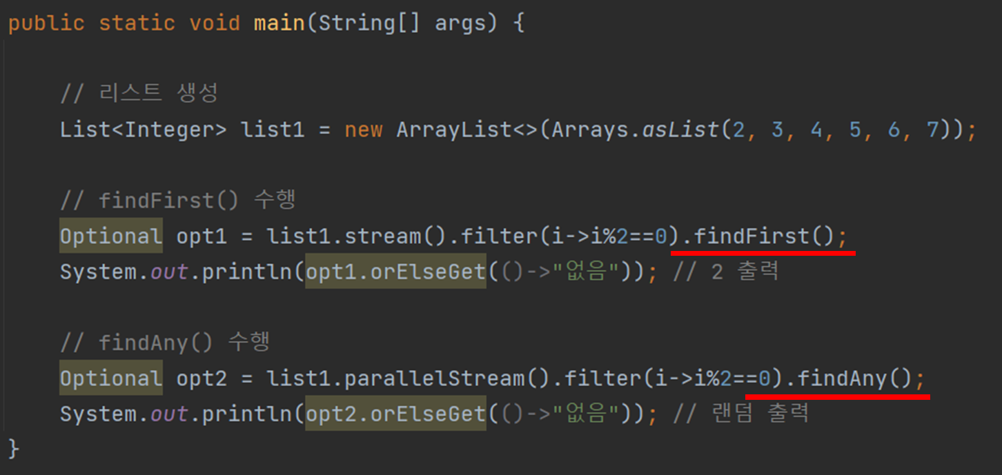 filter()를 통해서 걸러진 요소들 중 findFirst()는 첫 번째 요소를 findAny() 랜덤한 요소를 하나 반환한다.