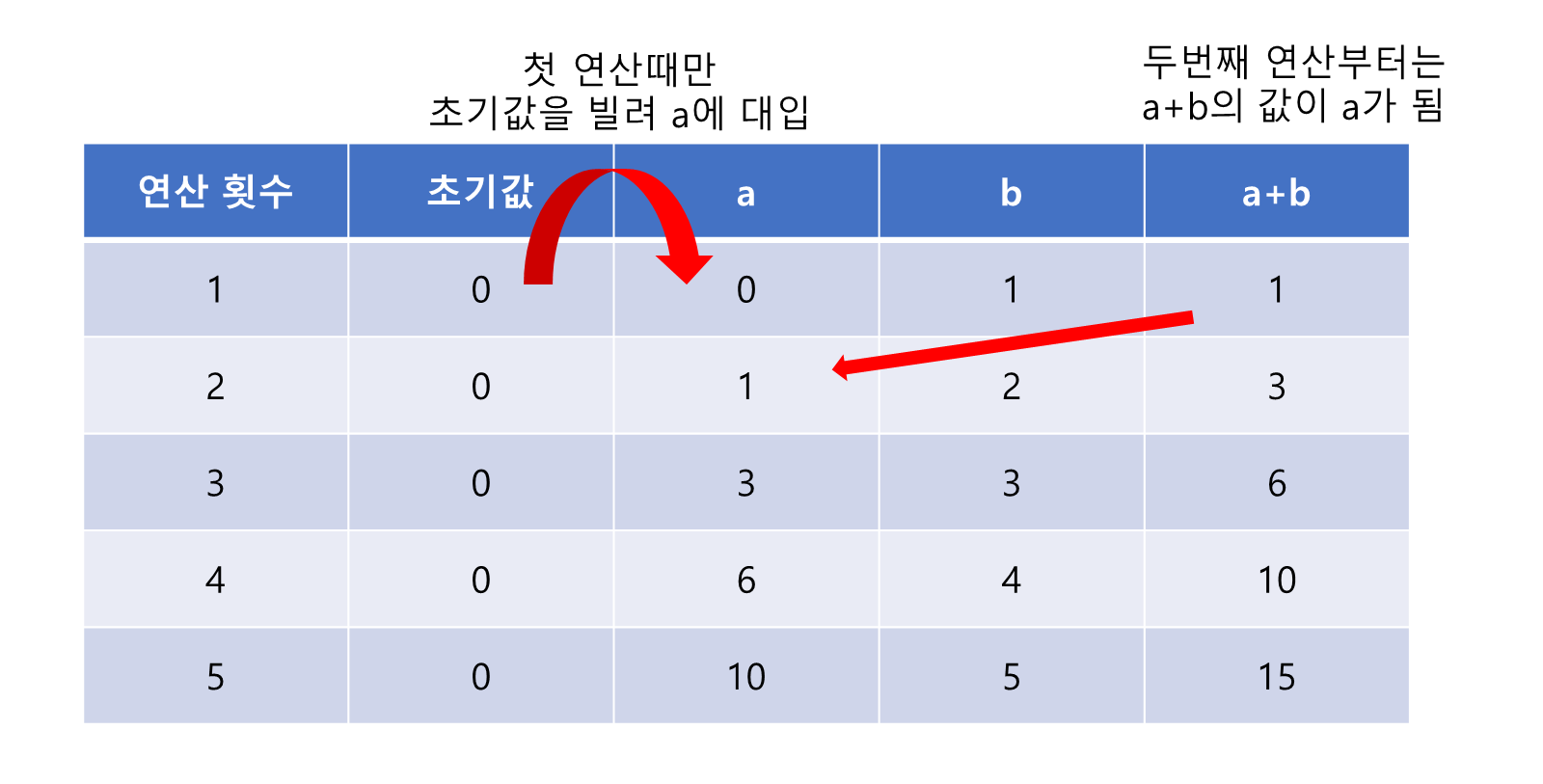 a는 처음 연산에만 초기값을 빌려 쓰고 그 다음 연산부터는 a는 연산의 결과인 a+b의 값을 사용한다.