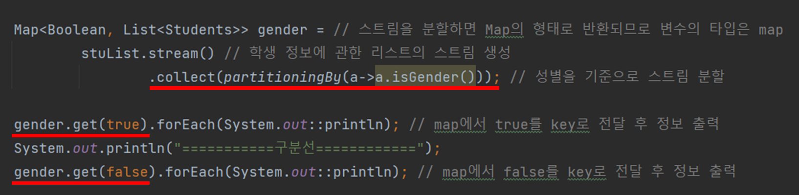 학생 정보를 가진 리스트의 스트림을 생성한 뒤 collect() 메서드 안에서 partitioningBy()를 사용하면 된다.
