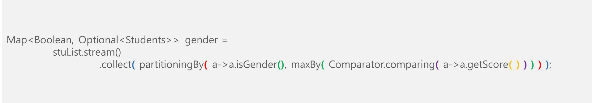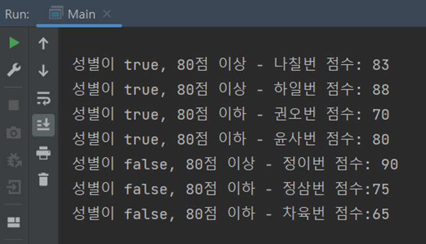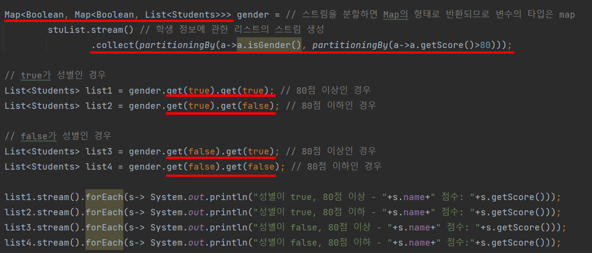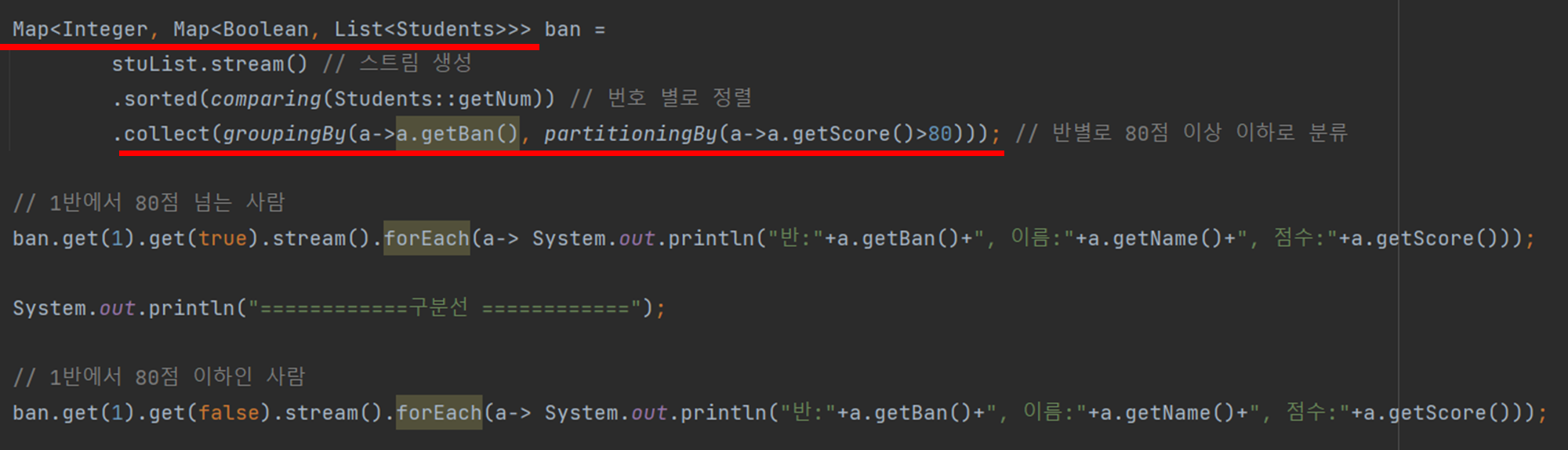 이때 안쪽의 partitioningBy()는 학생들의 점수를 받아와서 80점보다 높으면 true, 낮으면 false로 반환한다.