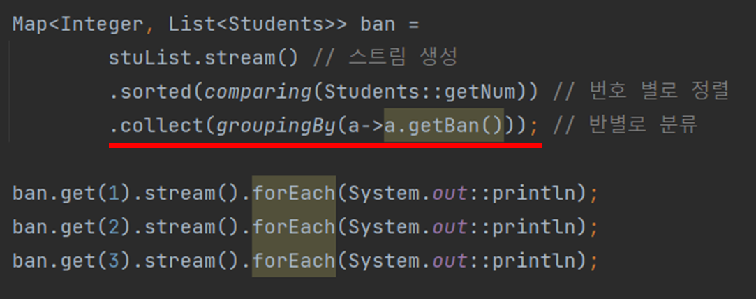 위 그림은 groupingBy()를 이용해서 반별로 분류를 한 코드를 나타낸 것이다.