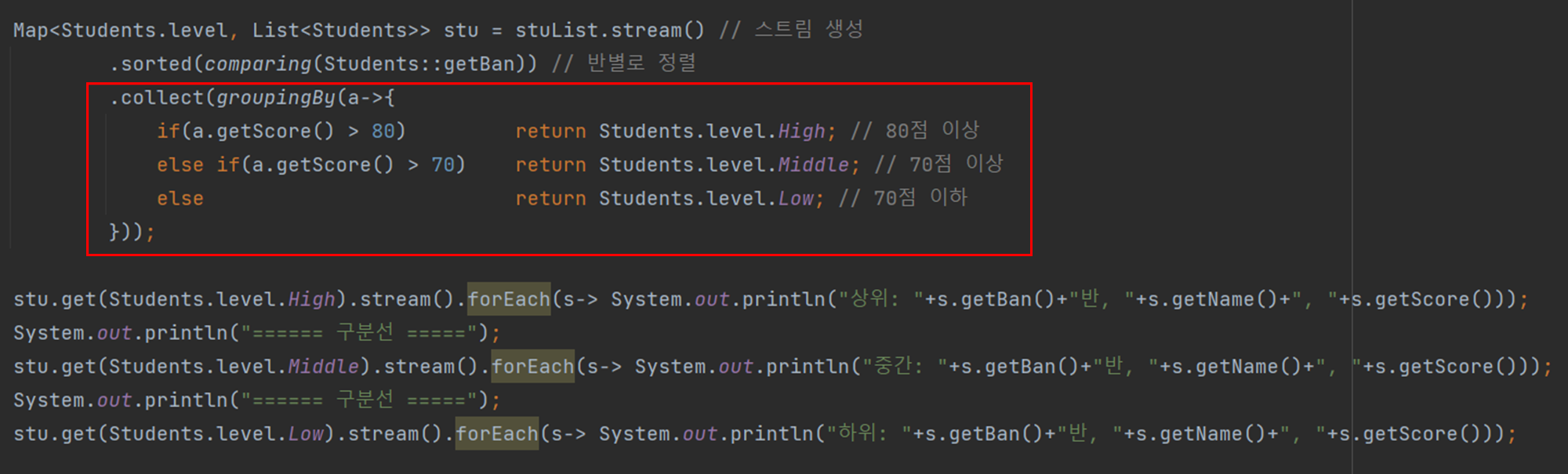 반면 한 반의 학생들을 점수별로 여러 그룹으로 나눌 때는 groupingBy()를 써야한다.