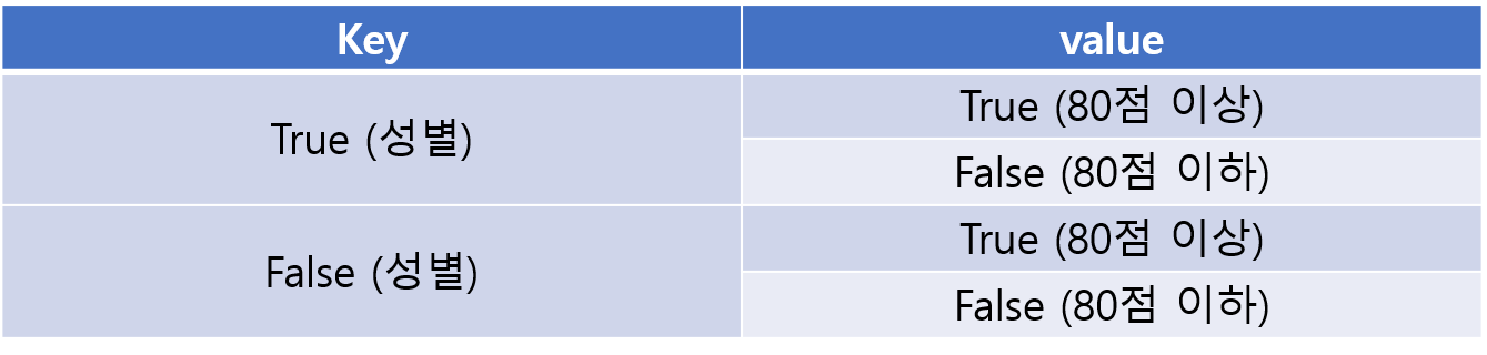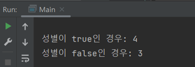 결과는 위와 같다. true를 성별로 가진 학생은 4명이고 false를 성별로 가진 학생은 3인걸 알 수 있다.
