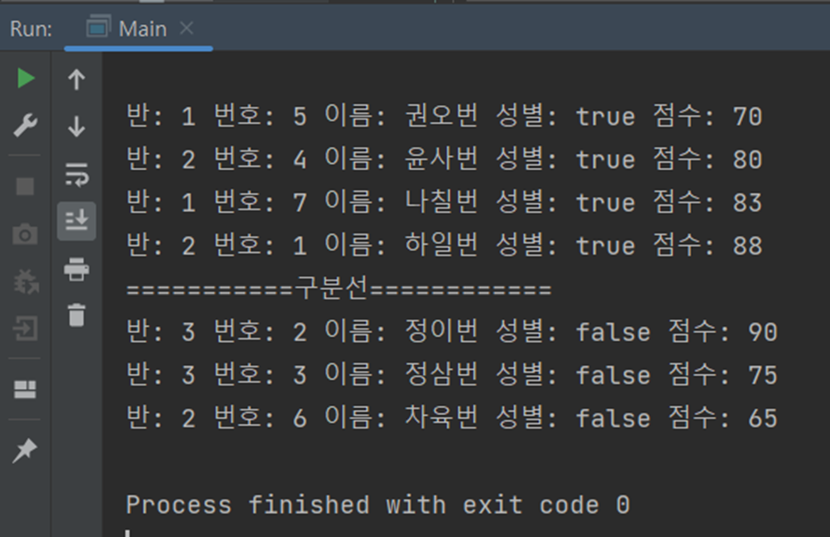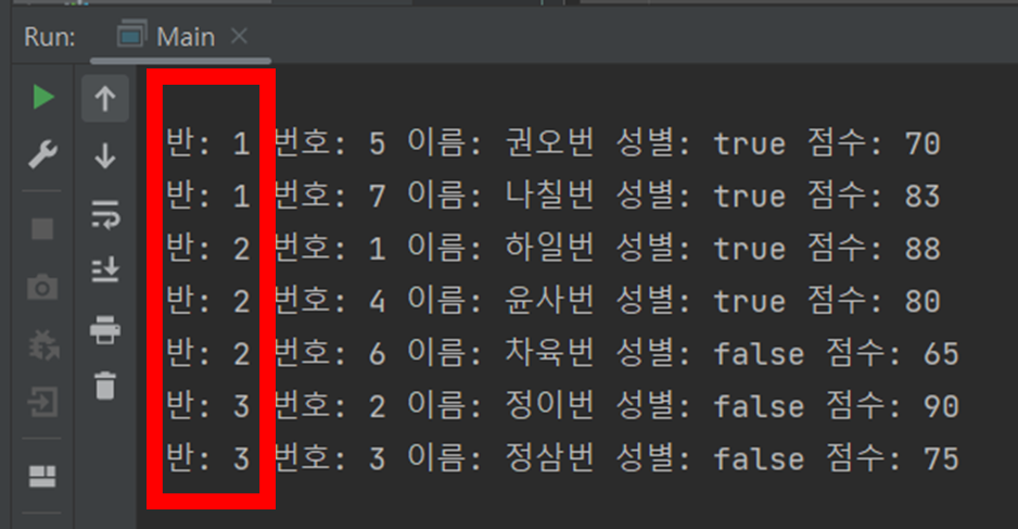 key의 경우 true, false로 나뉘고 value의 경우는 학생 정보가 담긴 객체를 담은 리스트 형태로 반환된다.
