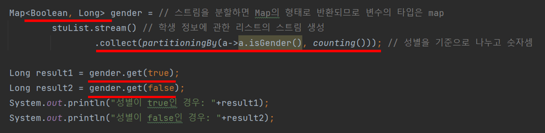 그래서 Map의 지네릭스는 <Boolean, List<Students>>에서 <Boolean, Long>으로 바꿔야 한다.