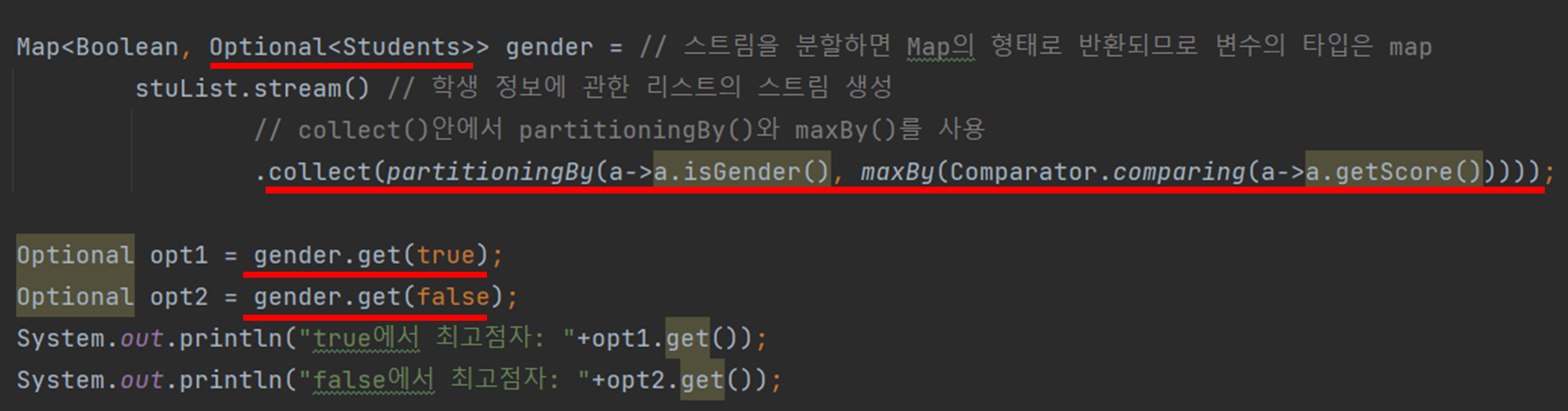 그 다음 partitioningBy() 안에서 isGender() 메서드 다음 maxBy()를 써준다.