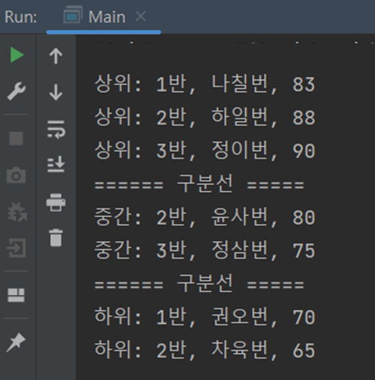 예상한대로 반별로 분할하고 점수 별로 분할한 결과물을 확인할 수 있다.