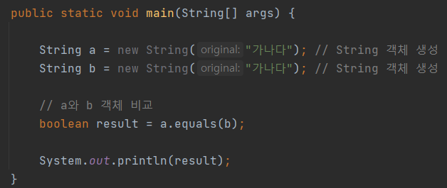 코드와 그 결과물에서 볼 수 있듯이 equals()는 두 객체가 같은지 다른지 판별해서 알려준다.