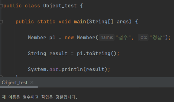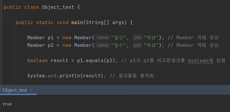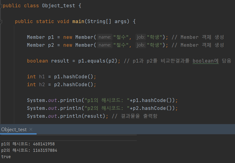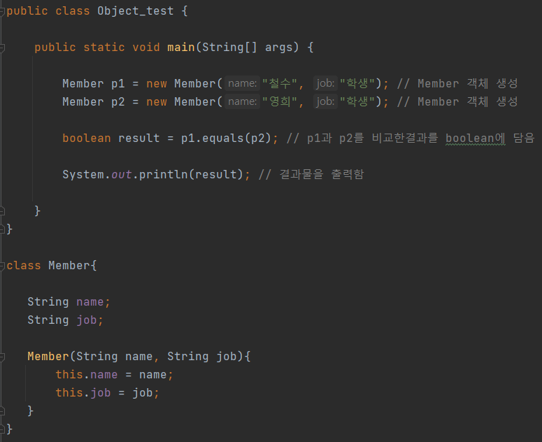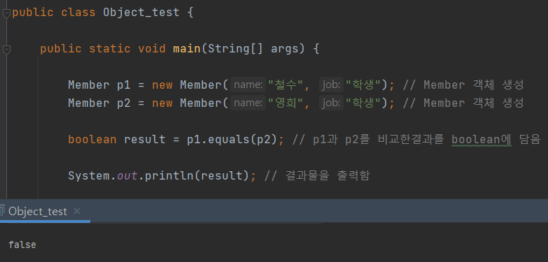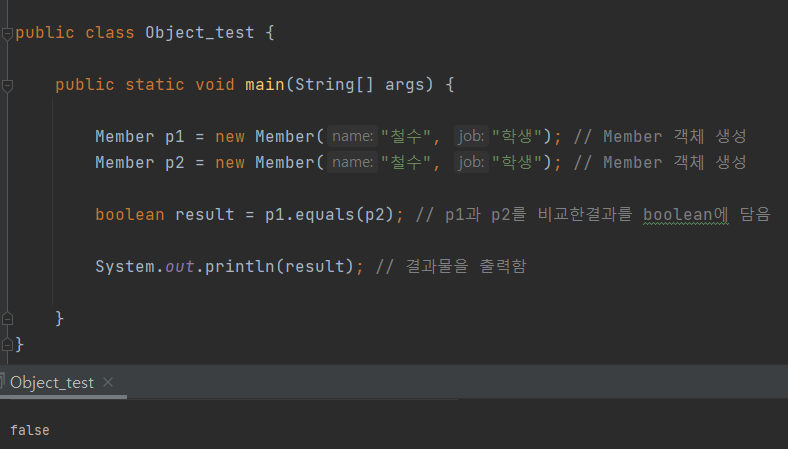 public class Object_test { public static void main(String[] args) { Member p1 = new Member("철수", "학생"); // Member 객체 생성 Member p2 = new Member("영희", "학생"); // Member 객체 생성 boolean result = p1.equals(p2); // p1과 p2를 비교한결과를 boolean에 담음 System.out.println(result); // 결과물을 출력함 } } class Member{ String name; String job; Member(String name, String job){ this.name = name; this.job = job; } }