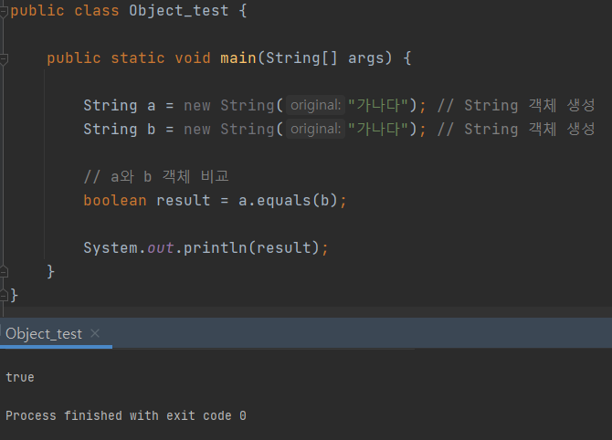 그래서 String클래스를 구현한 객체들은 문자열이 같으면 equals()의 값으로 true가 반환된다.