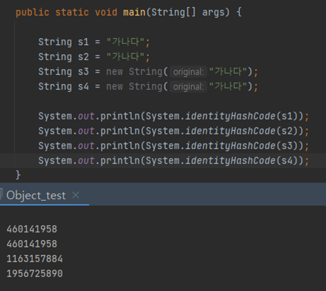 String클래스가 오버라이드됐다는 사실은 해당 객체들의 실제 해시코드를 확인해보면 알 수 있다.