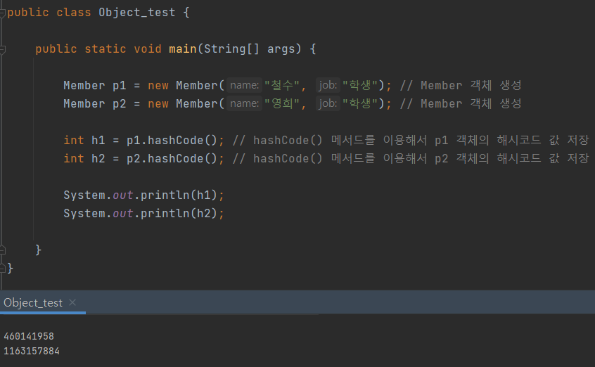 public class Object_test { public static void main(String[] args) { Member p1 = new Member("철수", "학생"); // Member 객체 생성 Member p2 = new Member("영희", "학생"); // Member 객체 생성 int h1 = p1.hashCode(); // hashCode() 메서드를 이용해서 p1 객체의 해시코드 값 저장 int h2 = p2.hashCode(); // hashCode() 메서드를 이용해서 p2 객체의 해시코드 값 저장 System.out.println(h1); System.out.println(h2); } } class Member{ String name; String job; Member(String name, String job){ this.name = name; this.job = job; } }