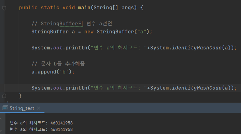위의 코드 StringBuffer는 문자열 변경에도 인스턴스를 새로 생성하지 않기 때문이다.