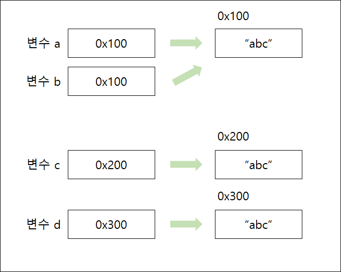 문자열 리터럴을 지정하는 방식으로 쓰면 변수들은 메모리상의 문자열을 재활용해 참조한다.